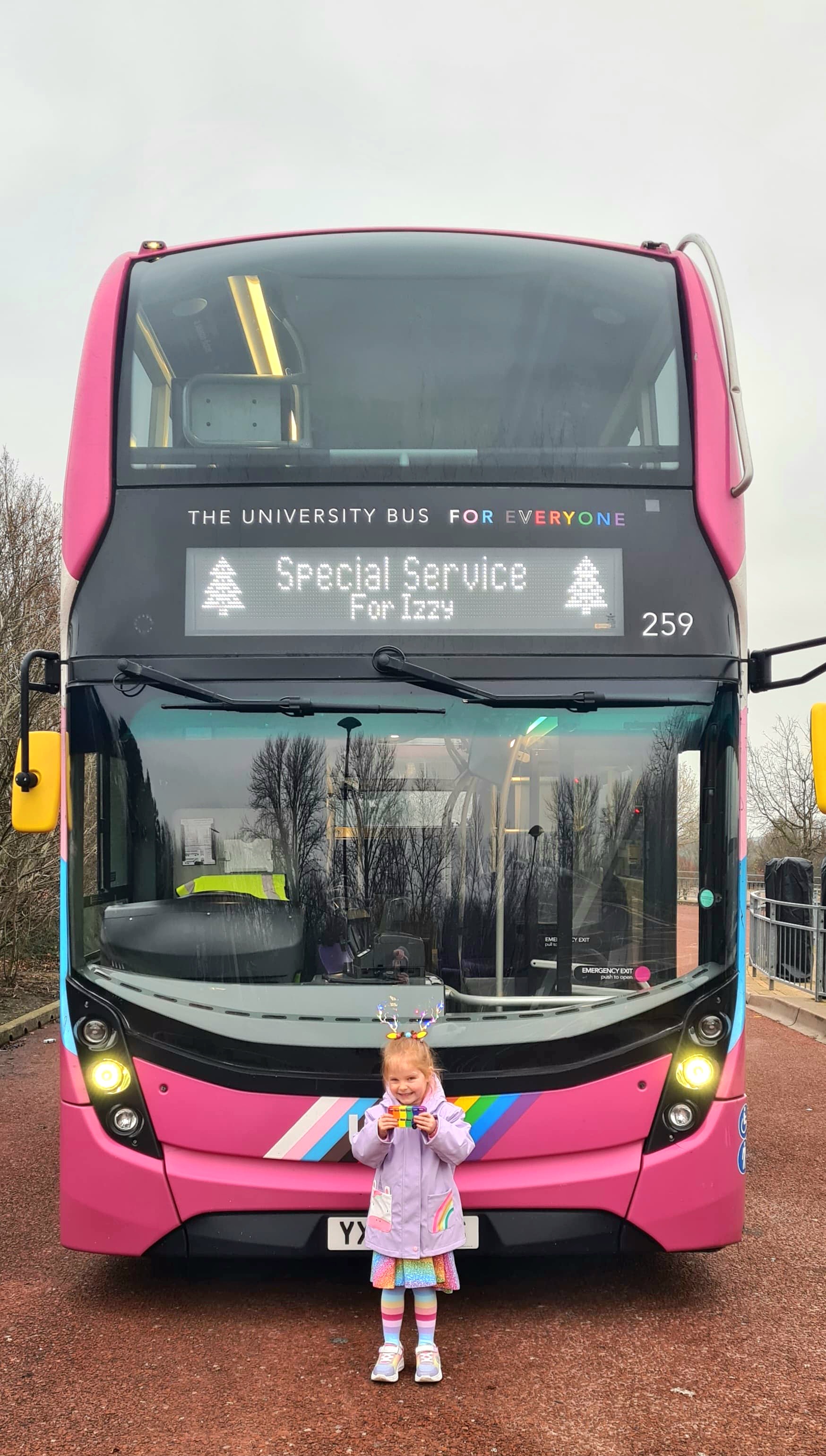 Today saw a special bus on the roads of Hatfield. Young bus fan Izzy, who loves rainbows, often sees the Pride bus go past but doesn't get a chance to ride on it. She had an early Christmas treat today when our Commercial Technical Assistant, Rob Tillotson arranged with her parents to pick them up and take them for a drive. After a drive around Hatfield and a stop off for photos, Izzy and her friend received goodie bags with sweets and gifts, and Izzy received a pin badge of the bus, which she has attached to her school bag to show all her friends. We wish Izzy and her family and friends a great Christmas and a Happy New Year!!
